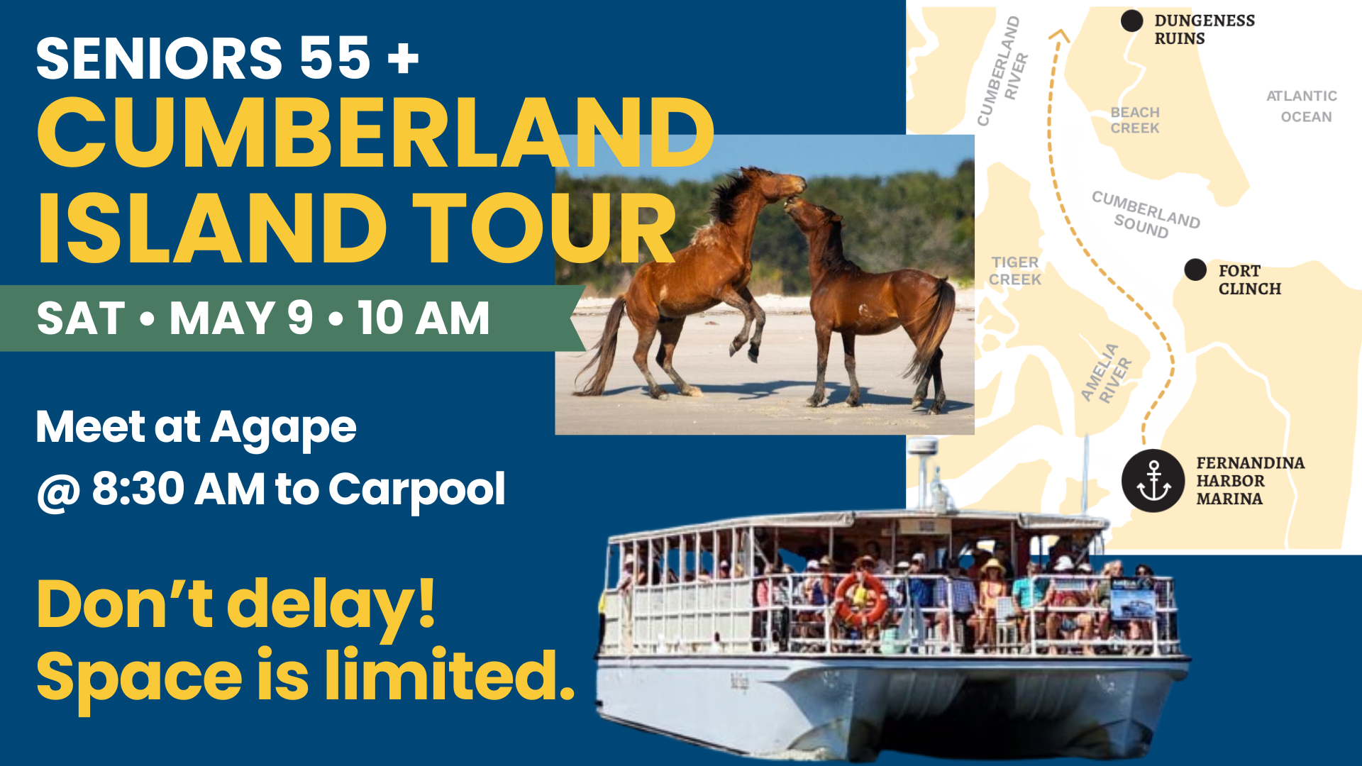 We’ll enjoy a peaceful 2.5-hour narrated cruise along the scenic coastal waterways of Florida and Georgia, taking in views of Cumberland Island, local wildlife, and historic landmarks—you might even catch a glimpse of the famous Cumberland Island horses. Along the way, we’ll share a bagged lunch and spend time with people you know and love.